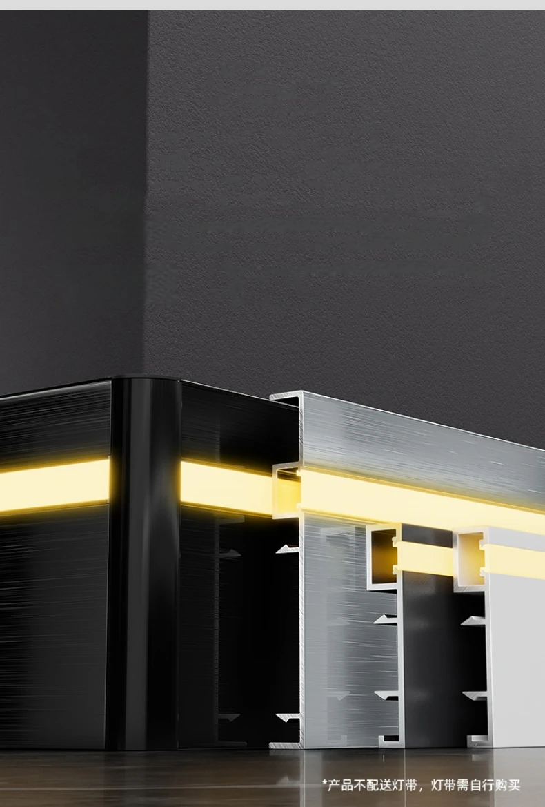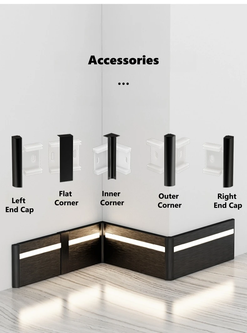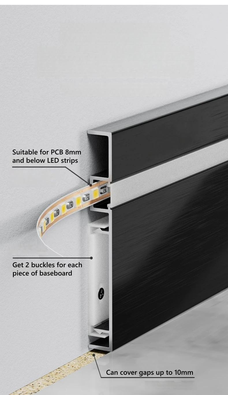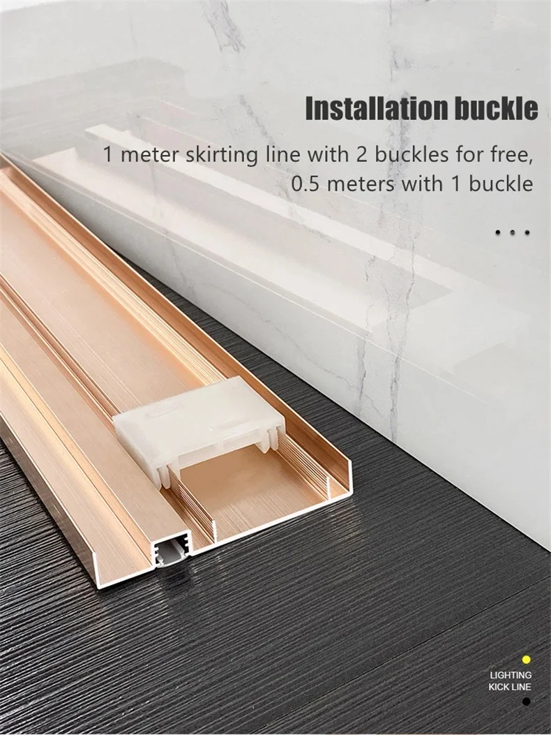 Each meter of baseboard includes 1 aluminum groove + 1 PC cover + 2 Buckles.